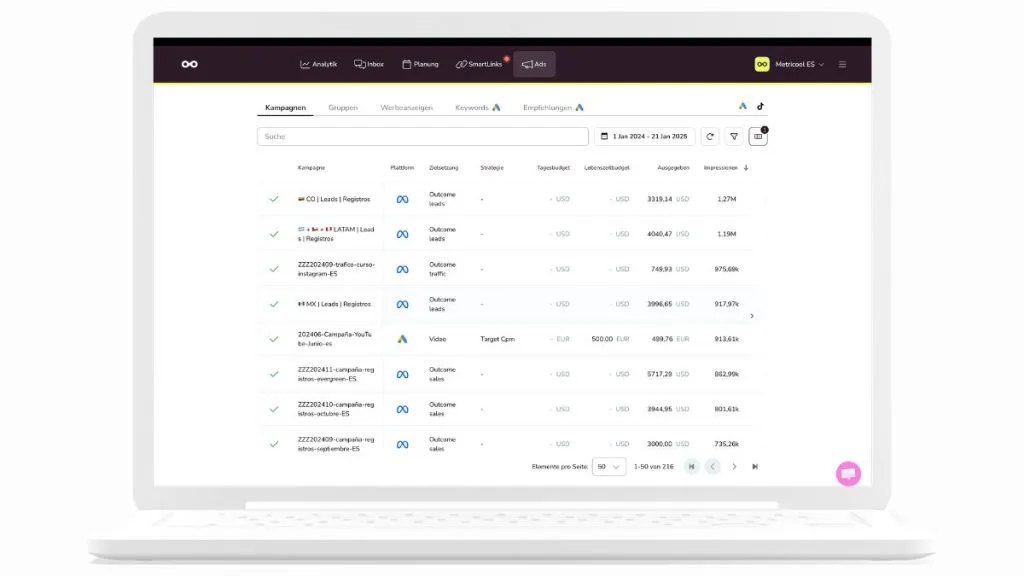 Das Schalten der Anzeige ist nur der Anfang. Die kontinuierliche Analyse ist der Schlüssel zum Erfolg. Mit der TikTok Ads-Integration von Metricool kannst du die Performance deiner Kampagnen einfach und übersichtlich verfolgen.