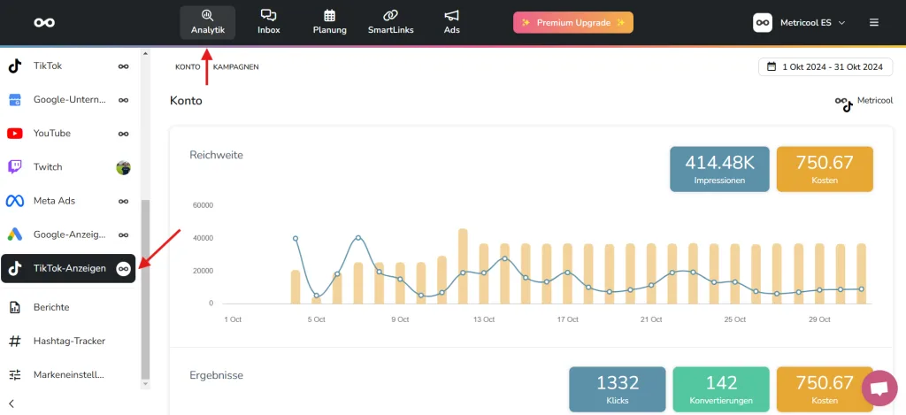 Sobald dein TikTok Ads-Konto verbunden ist, gehe zum Tab „Analytik“ und klicke auf der rechten Seite auf „TikTok-Anzeigen”. In der oberen rechten Ecke kannst du den gewünschten Analysezeitraum auswählen. Dort erhältst du alle relevanten Daten zu deinen Kampagnen und kannst eine detaillierte Analyse durchführen.