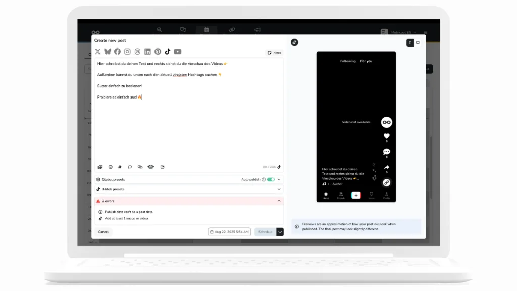 Hier findest du eine Schritt-für-Schritt-Anleitung zum Planen deiner TikTok-Videos mit Metricool – und weitere Infos zu den Vorteilen der Plattform.