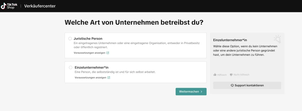 Wenn du zu den Glücklichen gehörst und TikTok Shop in deinem Land bereits verfügbar ist, musst du zuerst das Anmeldeformular im TikTok Shop Seller Center ausfüllen.