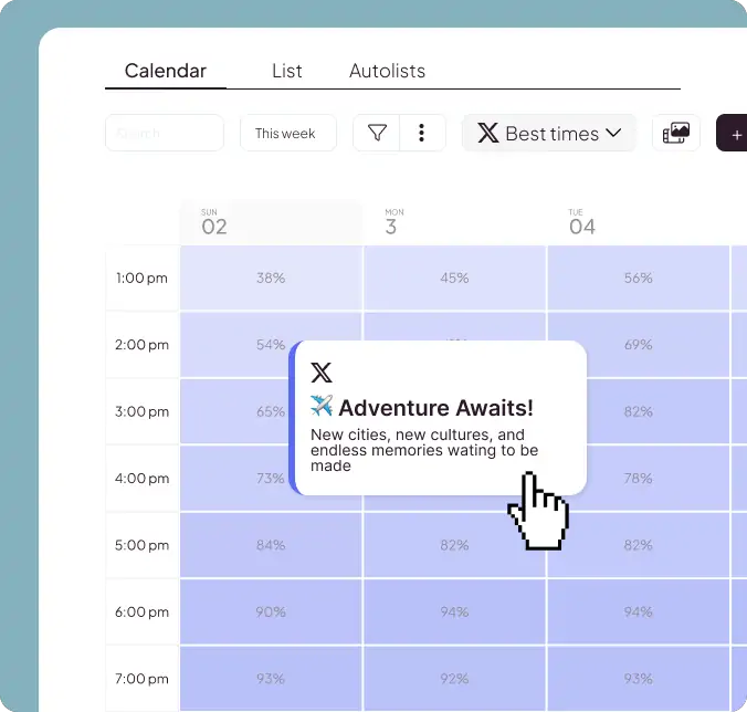 Ein Kalender, mit dem du deine Inhalte in Sekunden planst und alle fortgeschrittenen Tools nutzt – vom KI-Assistenten bis zum Bild- und Video-Editor. Alles, was du für schnelles Wachstum auf X brauchst.