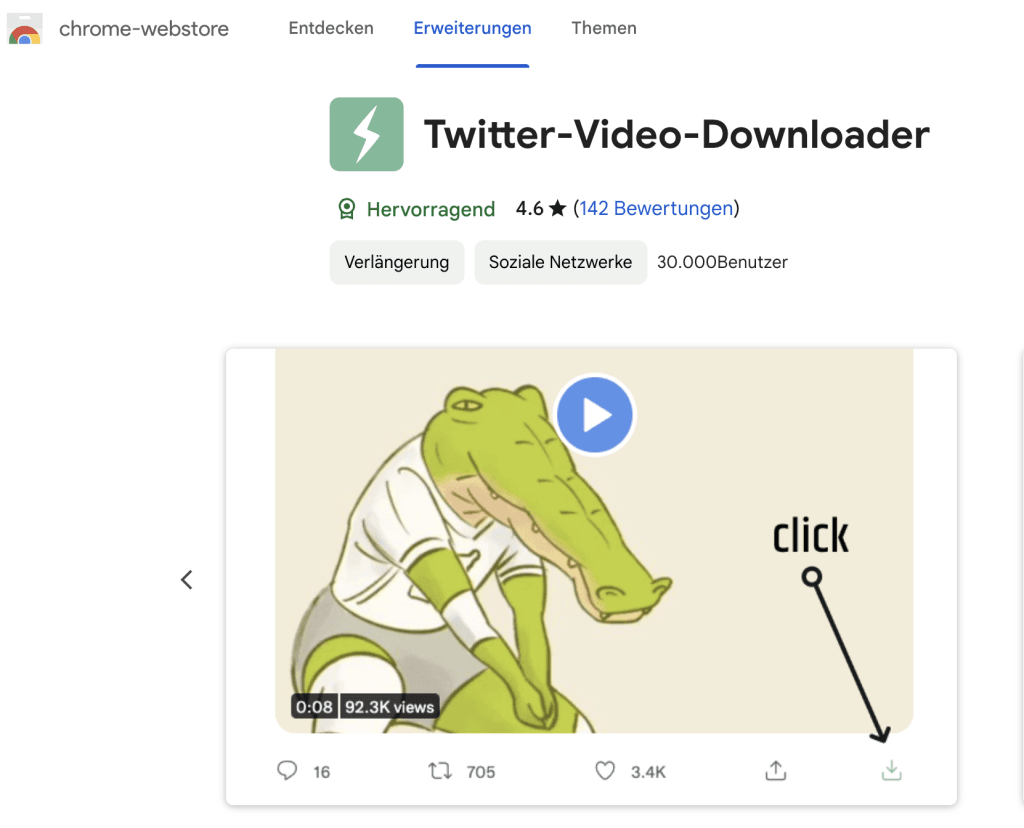 ▶️Twitter Video Downloader für Google Chrome: Diese Erweiterung fügt einen Download-Button neben jedem Video auf der Twitter-Website hinzu. Du kannst einfach auf den Button klicken, um das Video herunterzuladen.