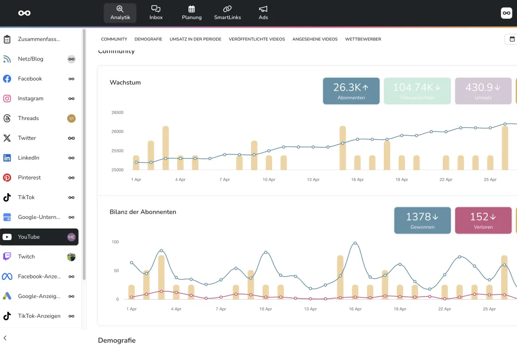💡 Nun hast du dein YouTube-Konto erfolgreich mit Metricool verbunden und kannst ab sofort die Metriken deines YouTube-Kanals auf einen Blick sehen: Wachstum des Kanals, Metriken deiner geteilten Videos, die Charakteristiken deiner Follower und sogar deiner Konkurrenten.