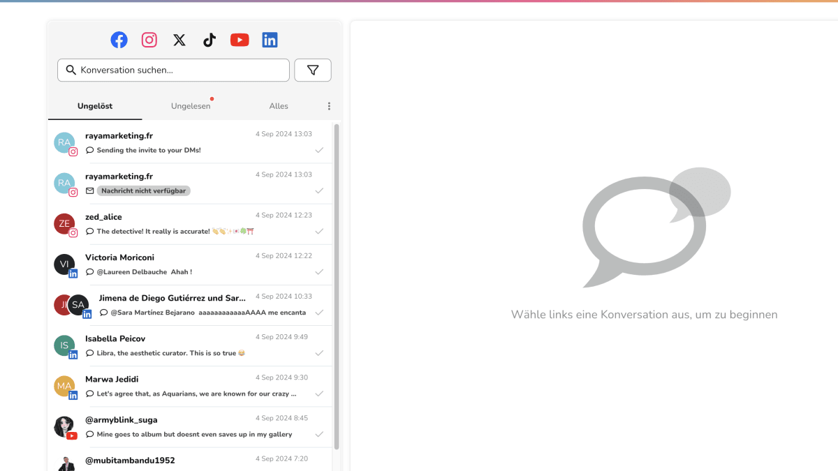 3️⃣ Sortiere die Nachrichten nach ungelesenen oder unbeantworteten Nachrichten, antworte auf jede davon oder markiere sie als unerledigt, wenn du dir noch nicht sicher bist, wie du antworten sollst. Du kannst nach Netzwerk, Nachrichtentyp oder Benutzer filtern, um gezielt zu antworten.