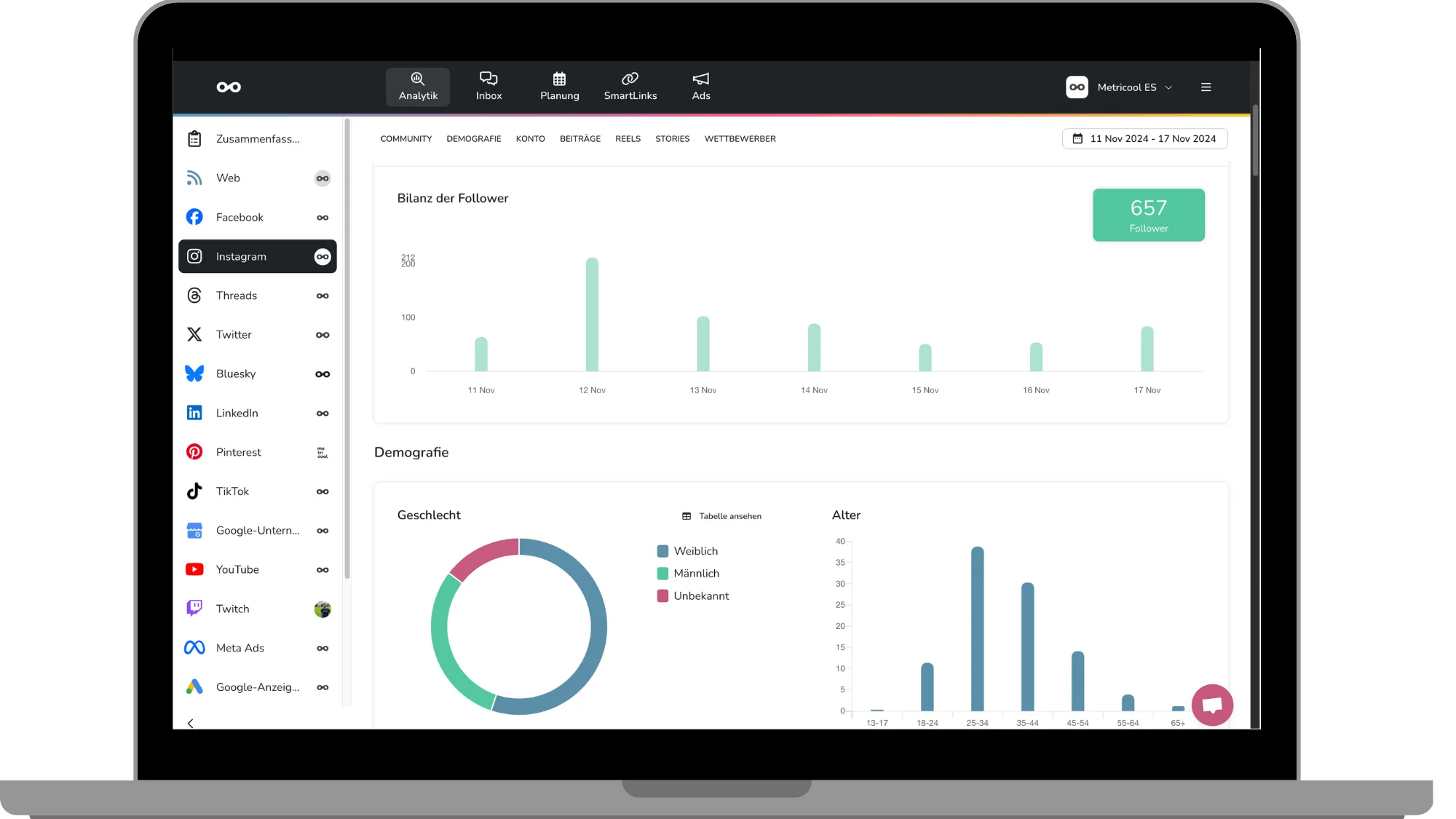 Sobald du dir Gedanken gemacht und deine Zielgruppe definiert hast, liefert dir Metricool alle anderen Daten, die du für die Analyse deiner Zielgruppe auf Instagram brauchst.