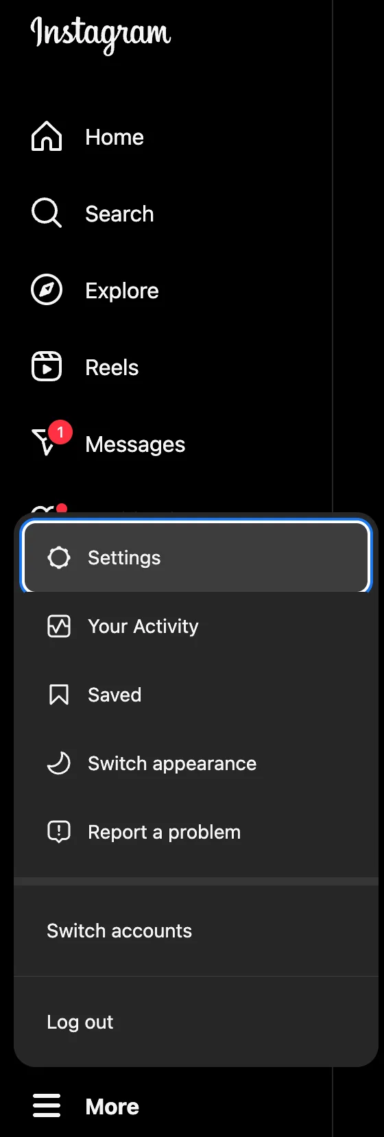 - On the Instagram desktop version, click on the three lines in the bottom left corner. Click on “Settings”.