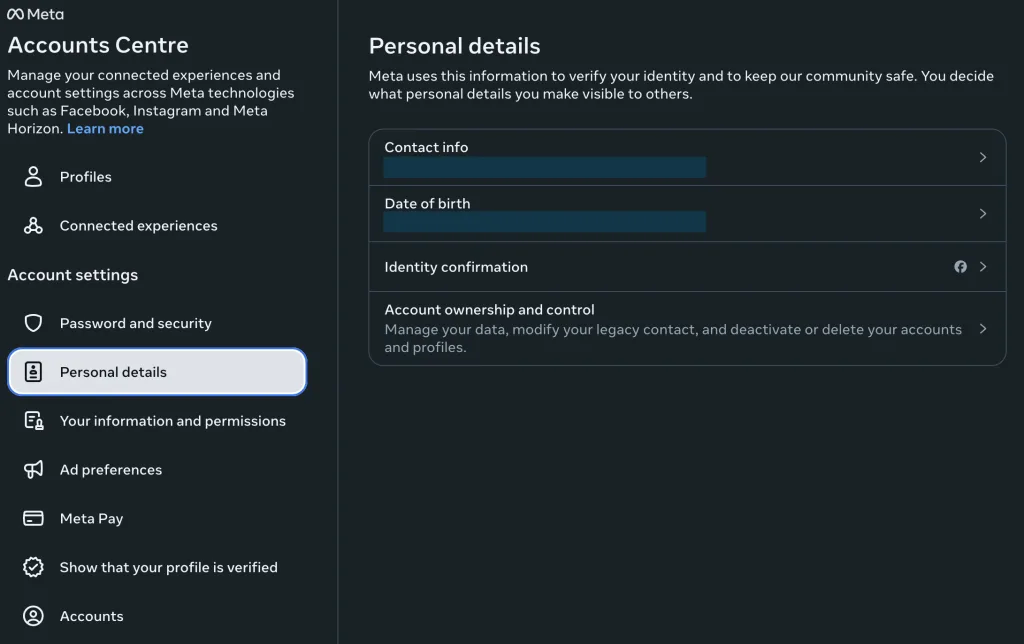 - This will show your Meta accounts center, in which you will click on “Personal details.”