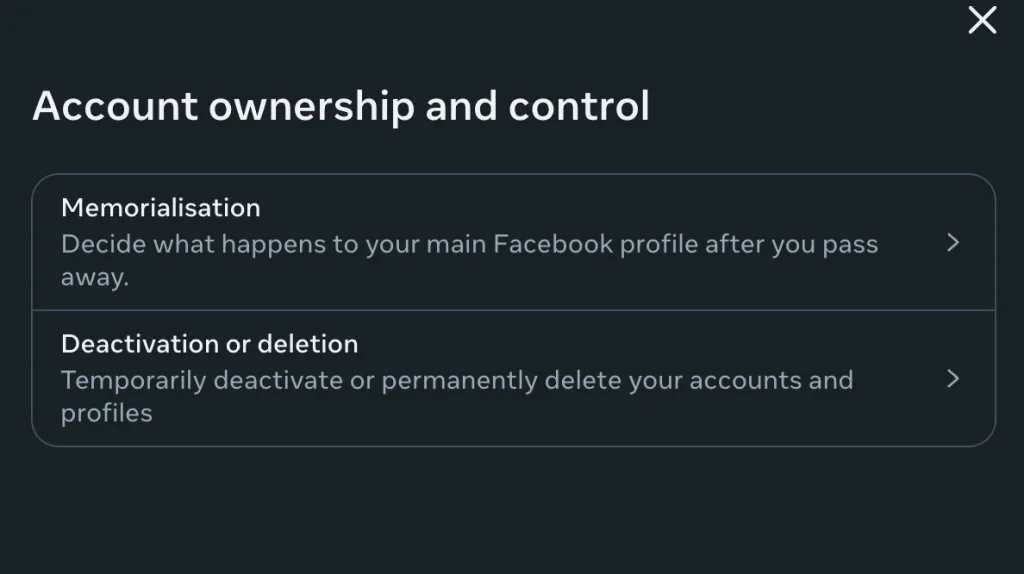 - When clicking “Deactivation or deletion”, you can choose between deactivating your account or permanently deleting the account.