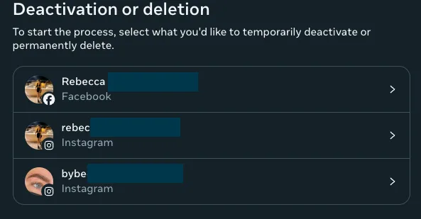 - After clicking on “Deactivation or deletion”, select the account, and whether you want to temporarily deactivate it or delete it permanently.