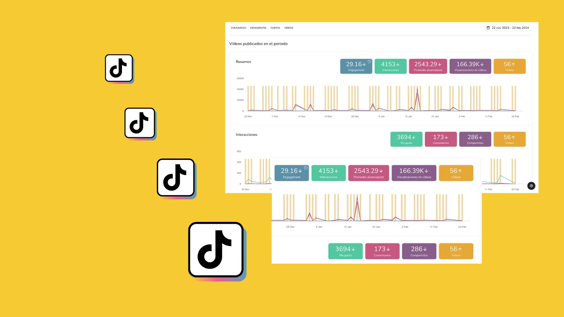 Aquí encontrarás un resumen de las métricas de tus videos: engagement, interacciones, alcance, visualizaciones y videos subidos.