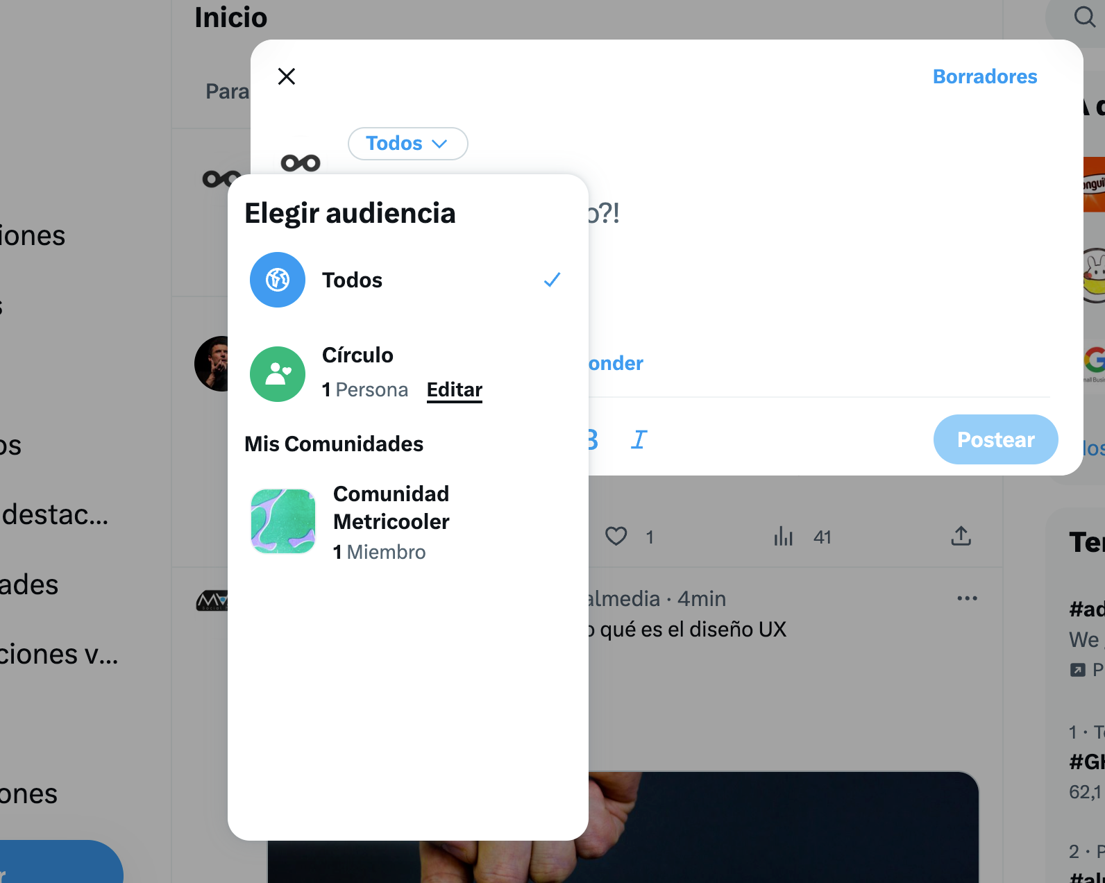 - En la parte superior de la caja de redacción de tweet tienes la opción de audiencias.