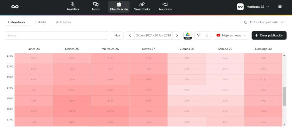 En Metricool, puedes hacerlo de forma sencilla: en el planificador tienes un mapa de calor con las mejores horas para publicar en YouTube. Así ajustas tu calendario de publicación sin ir a ciegas.
