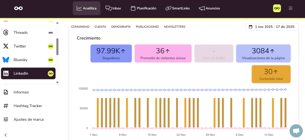 Desde tu panel puedes administrar varios perfiles o páginas de LinkedIn sin salir de la herramienta: solo tienes que cambiar de cuenta, programar o revisar lo que necesites y seguir trabajando