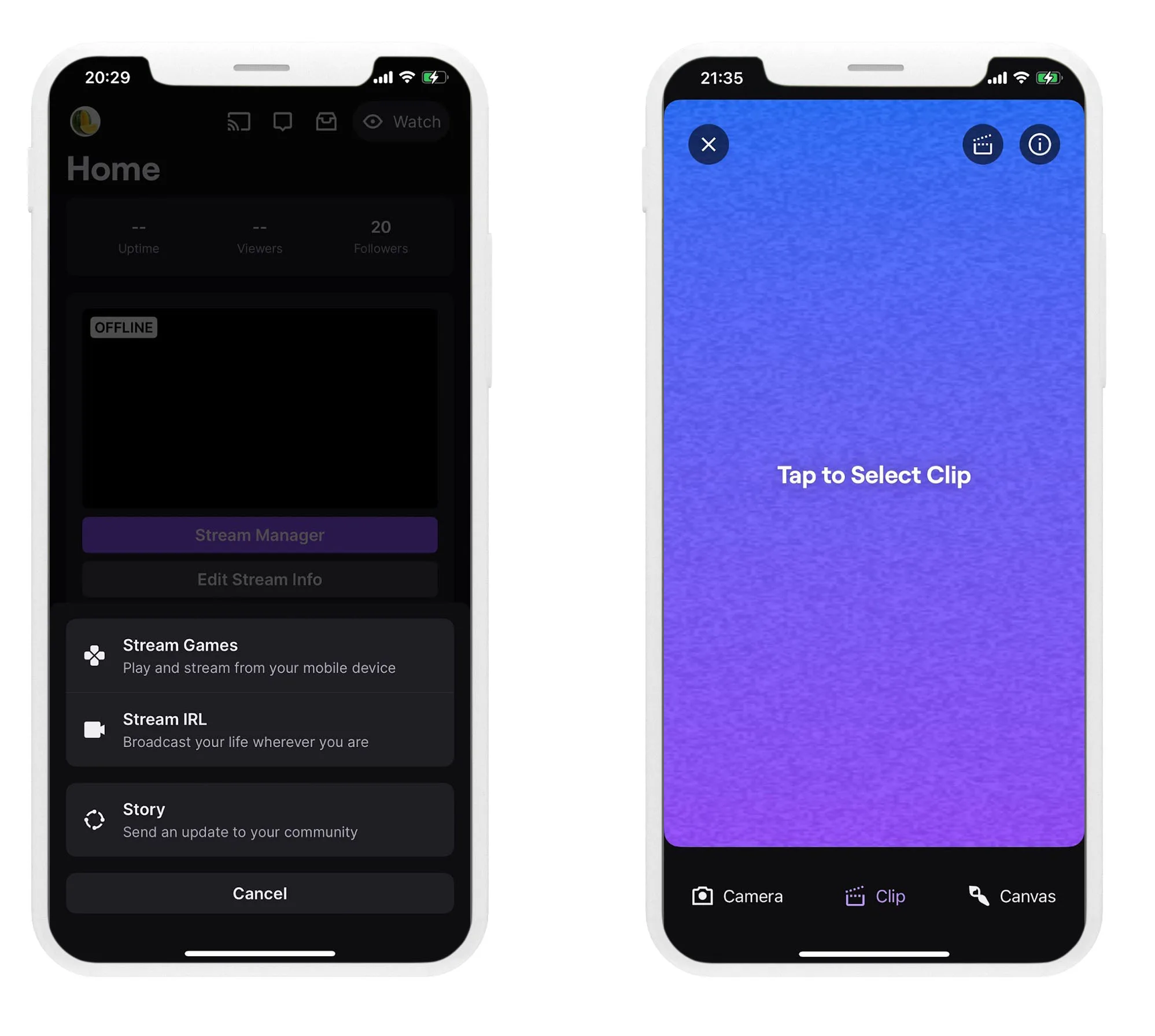 - Elige la opción de cámara, para capturar tu story ahora o elegir una de tu galería, un clip de tus directos o de otro streamer y un lienzo para escribir.