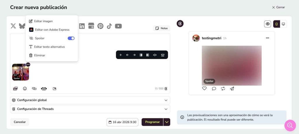 Además, si trabajas con imágenes, en Metricool puedes programar tus publicaciones de Threads y marcar la imagen como spoiler directamente desde el planificador, para que quede lista y se publique en la fecha y hora que hayas elegido.
