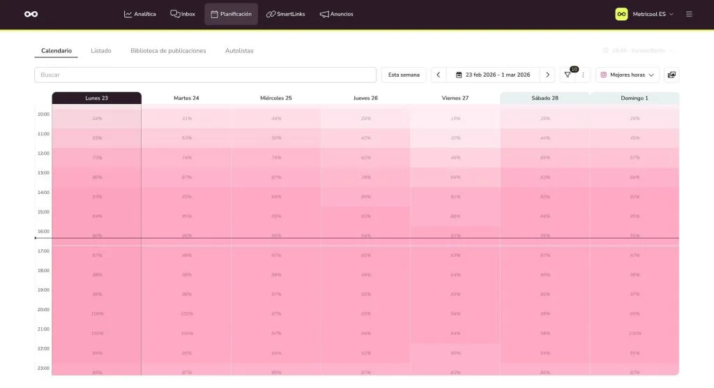 Es simple: conectas tu cuenta y en el planificador verás las mejores horas en un color más oscuro del habitual (rosa más oscuro) y el porcentaje de usuarios en número.