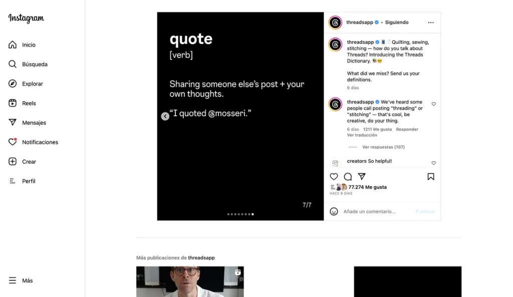 En él podemos ver qué significa cada término, sobre todo el de diferenciar ‘Threads‘ de ‘thread‘: el nombre de la aplicación y un hilo de discusión. También ‘post’ es la publicación que un usuario puede hacer y sirve también para un verbo, postear. Para interactuar en Threads tienes tres opciones ‘reply’, para responder algún post, repost para compartir un post, el símil de retweet de Twitter y, por último, ‘quote’, el citar tweet, en el que compartes un post incluyendo tus pensamientos.