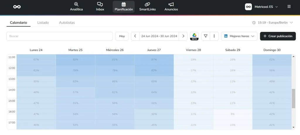 Con Metricool dispones de un calendario a través del que programar todo tu contenido en los días y las horas que quieras. Y no solo eso, también cuentas con este bajo la manga: las mejores horas para publicar en LinkedIn. Asegúrate de haber activado la opción y ¡listo!