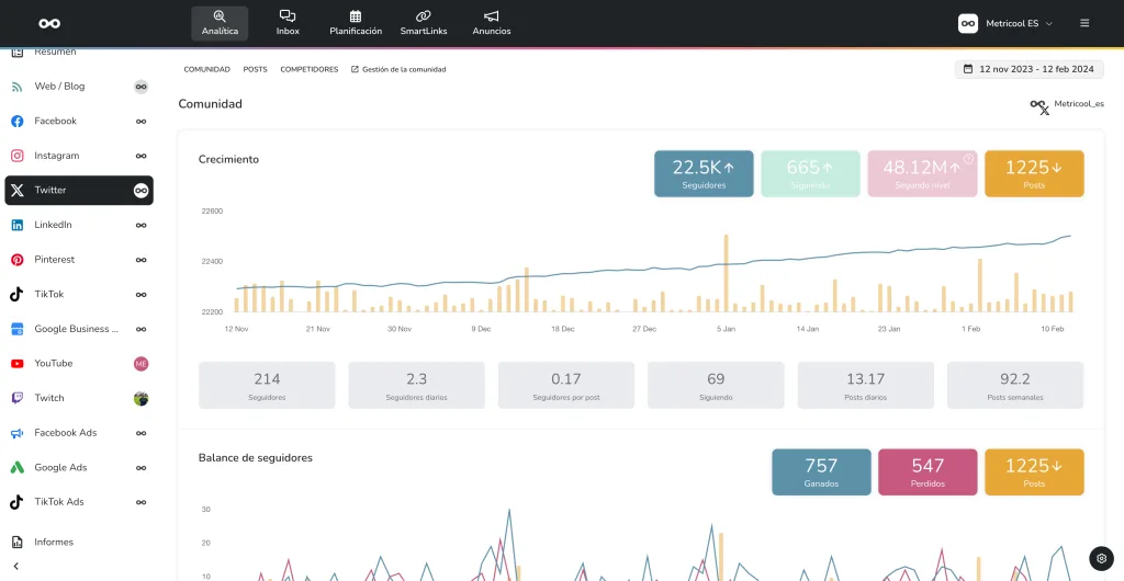 La opción que te recomendamos es Metricool, donde gestionarás tantas cuentas como necesites de Twitter mientras revisas y analizas tu trabajo.
