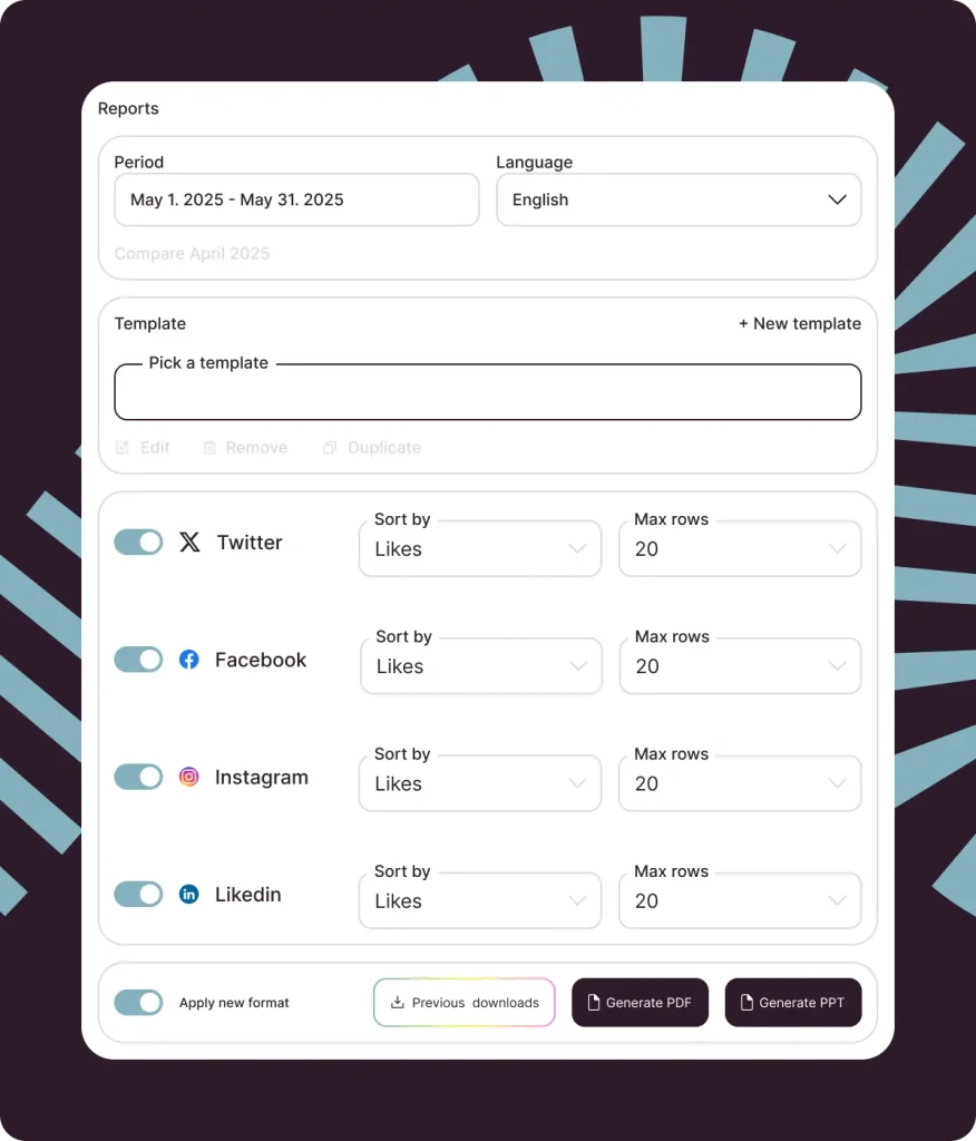 Personaliza tu plantillaEscoge colores, añade el logo de tu cliente y decide qué métricas incluir. Créala una vez y úsala para siempre.