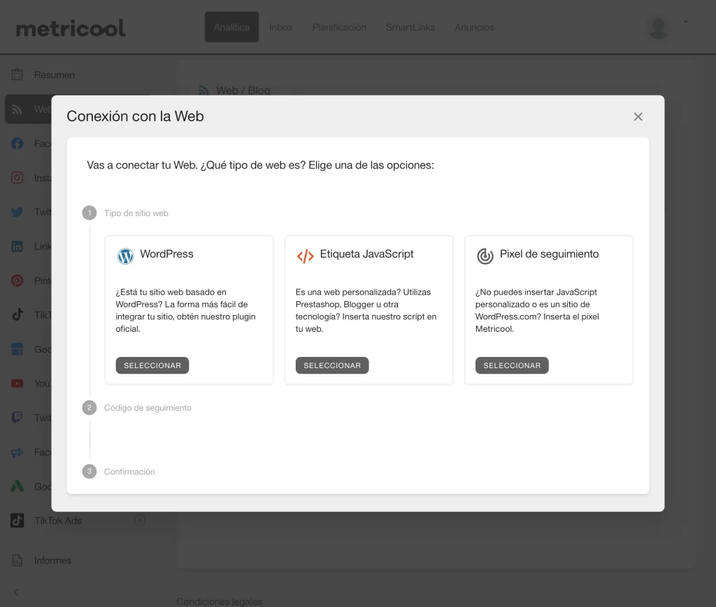 Hay tres opciones para integrar tu web con Metricool y así poder analizar todas las métricas de tu página.