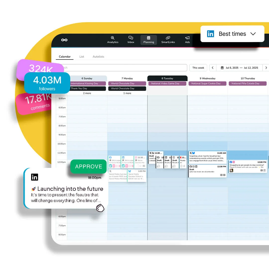 Planifica tu estrategia, programa tus publicaciones y mejora el impacto de tu perfil personal o perfil de empresa en un abrir y cerrar de ojos.