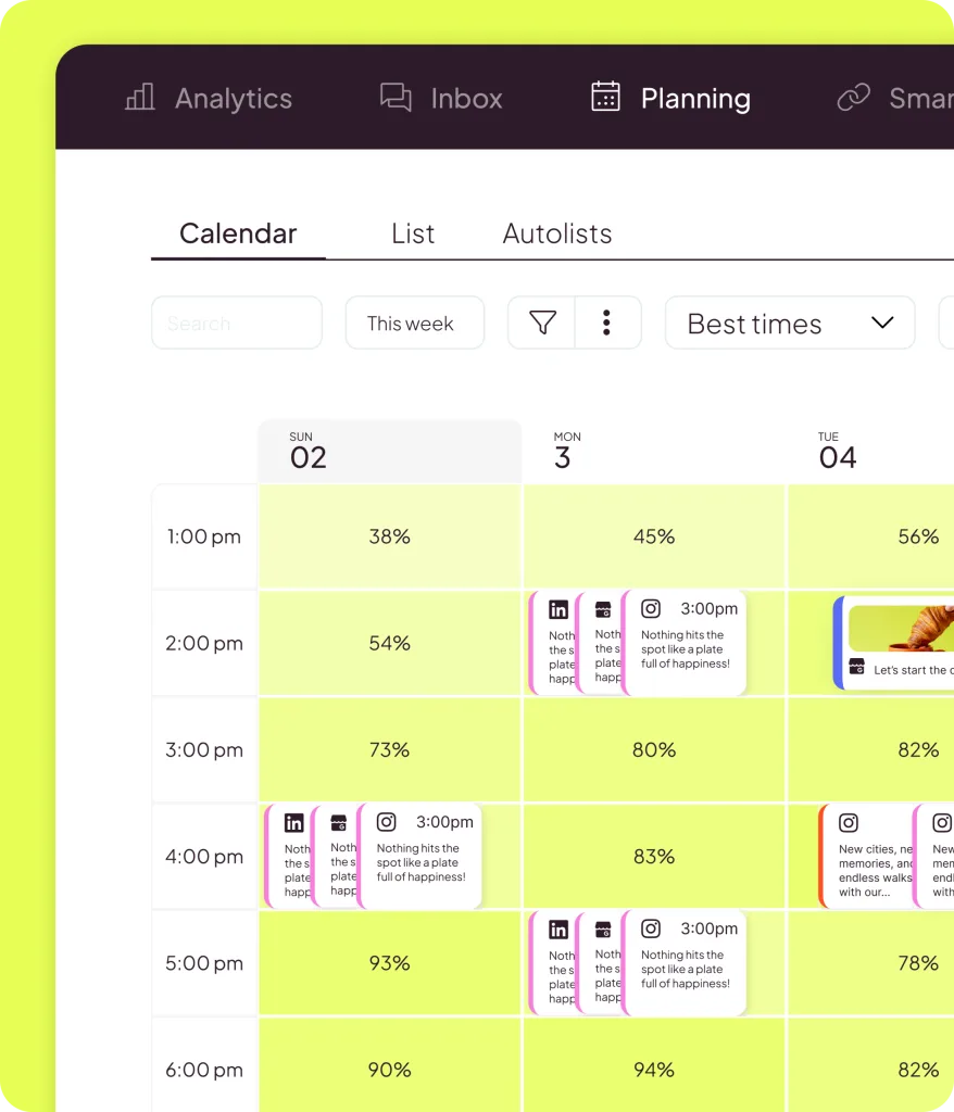 Planificador inteligente, función de arrastrar y soltar, los mejores horarios para publicar según cada cliente y gestión de contenidos con Canva y Google Drive.