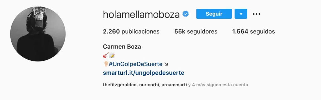 EJEMPLO: En este caso, la cantante Carmen Boza cuenta con 50 mil seguidores, donde sube contenido de su música y crece con su perfil personal.