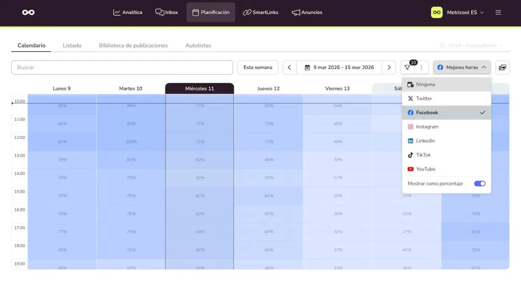 Dirígete a la pestaña de Planificación y echa un vistazo al calendario. Vas a ver que hay diferentes tonos de azul. ¿Qué quiere decir esto? Las franjas horarias con el azul más oscuro indican que es un buen momento para publicar. También puedes activar la visibilidad de los porcentajes, donde el mayor número indica a tus seguidores conectados.