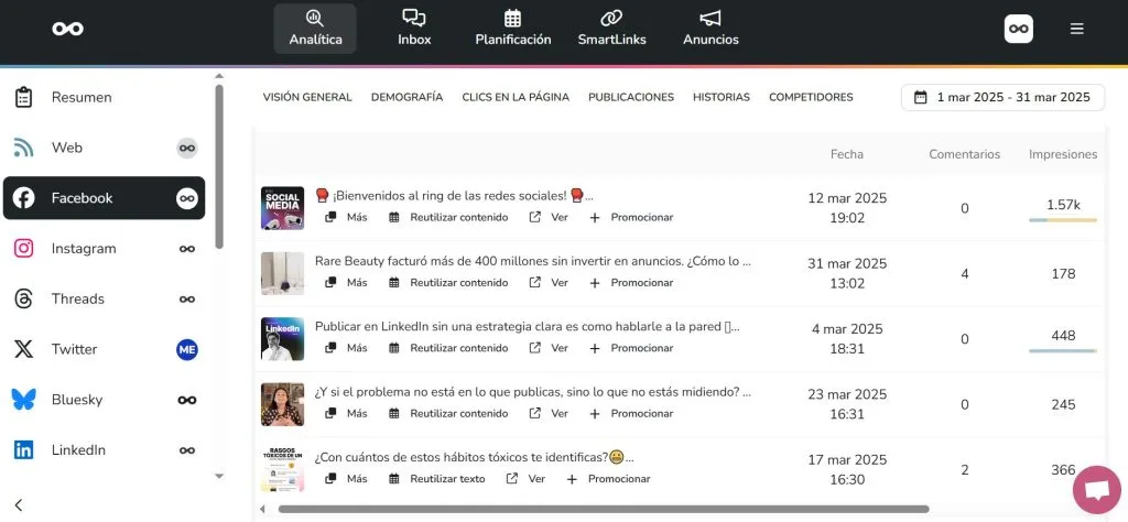 La otra opción para repasar cómo han funcionado tus publicaciones es ir a la sección de Analítica, elegir la red social que quieras y analizar en profundidad los datos: demografía, alcance, engagement, número de likes, guardados, visualizaciones o el origen de las fuentes de impresiones en TikTok, entre otras.