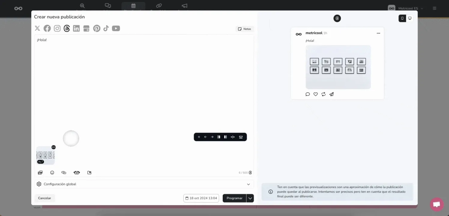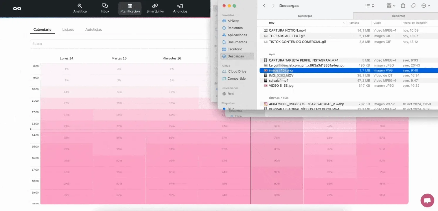 Subir archivos, ahora es más fácil que nunca. Solo tienes que arrastrar archivos multimedia desde tu ordenador al planificador. Se abrirá la ventana de crear publicación con el archivo subido.
