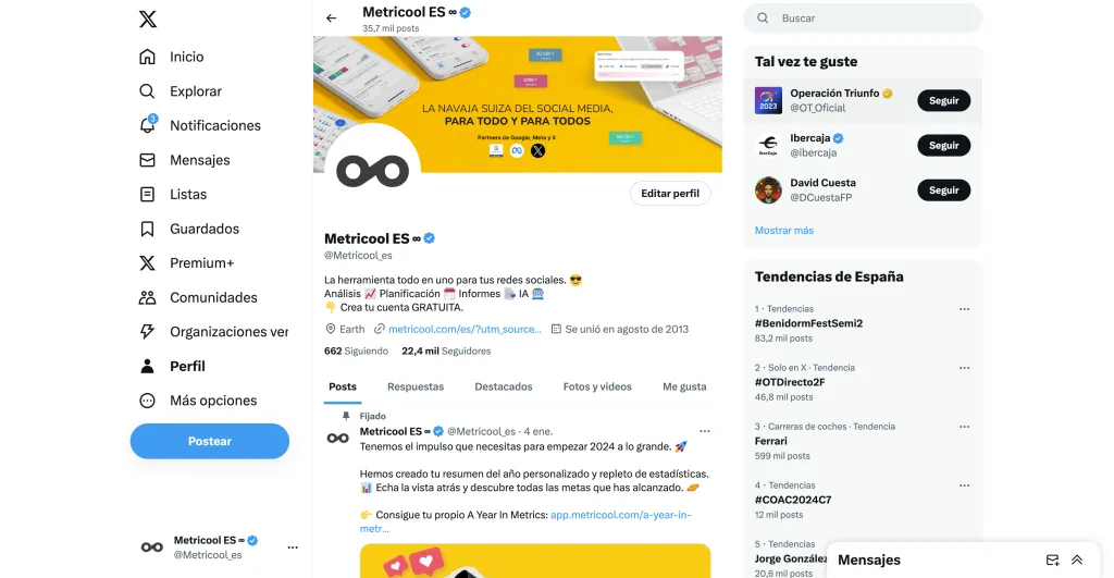 Prueba en Metricool las analíticas de Twitter (disponible en los planes Starter o superiores que añadan el complemento de pago) y mide tu evolución después de optimizar tu perfil.