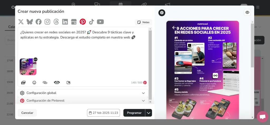 - Planificar el contenido: si recuerdas, una de las mejores opciones para preparar tu estrategia de contenidos es programarlo. Con Metricool puedes planificar tus pines con tanta antelación como necesites y Metricool lo publica automáticamente por ti.