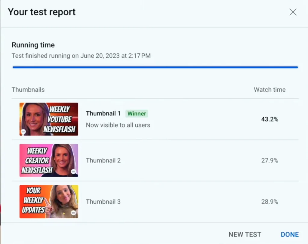 A la hora de elegir una portada para tu video, YouTube te dará la oportunidad de añadir hasta 3 imágenes diferentes para que la audiencia decida cuál le gusta más. Cuando el tiempo de prueba finalice, YouTube muestra en pantalla los resultados de qué portada ha obtenido más tiempo de visualización, siendo esta la ganadora y la que aparecerá en la cover del video.