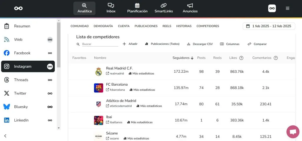 Metricool te permite realizar un benchmark donde podrás controlar a tus competidores en las redes sociales.