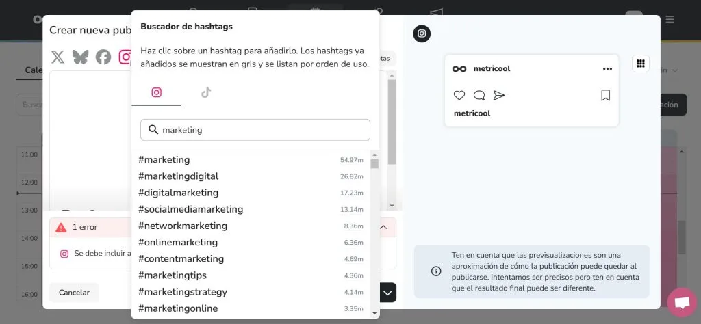 Con la funcionalidad, solo para usuarios Premium, de buscar etiquetas de Metricool puedes encontrar los hashtags ideales para el post que estás programando.