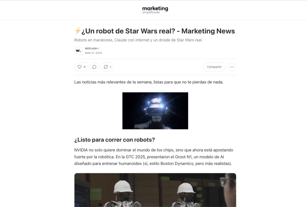 Marketing simplificado es la newsletter de la agencia de Weplash. Si no tienes mucho tiempo, esta newsletter va directo al grano.