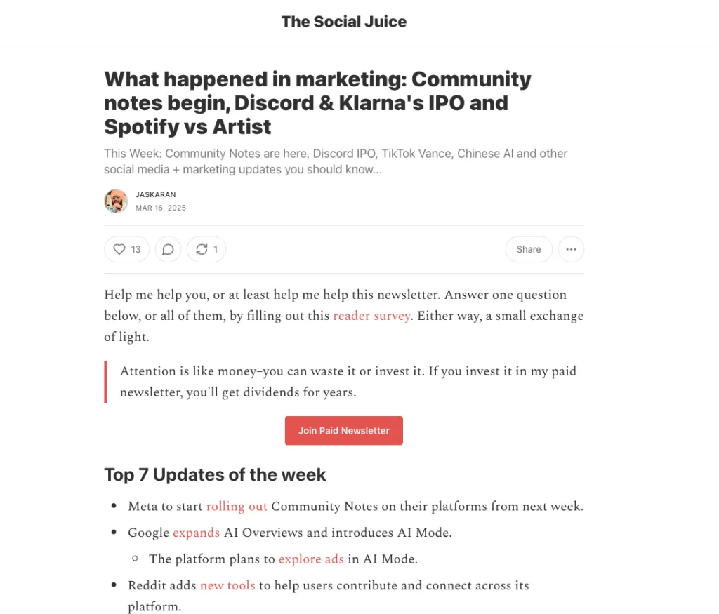 Como él mismo la define, “es la newsletter más útil del mundo para social media managers”. En ella vas a encontrar noticias de redes sociales, estadísticas y estrategias de marketing digital. Además, incluye guías, descargables y campañas virales que triunfan. Vamos, que tiene todos los ingredientes para convertirse en tu clic favorito de la semana.