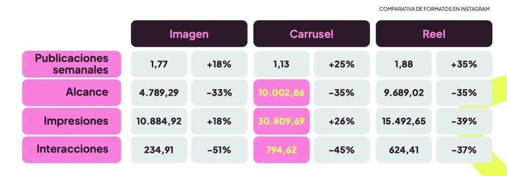 Los carruseles son el formato con mayor alcance, impresiones y engagement en Instagram, como vimos en el Estudio de Redes Sociales 2026. De hecho, aumentaron un 26 % las impresiones en el último año.