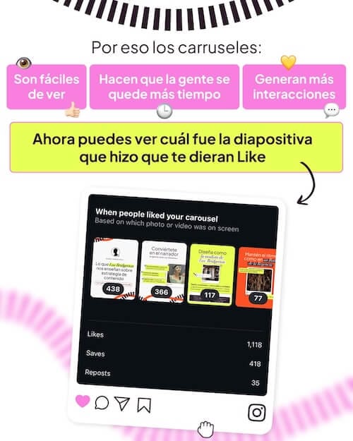 Tip extra: La portada de un carrusel es la que decide si paran el scroll y te eligen o pasan al siguiente contenido. Pero la segunda imagen es igual de importante porque Instagram da una segunda oportunidad a los carruseles mostrando la segunda imagen de nuevo en el timeline de los usuarios.
