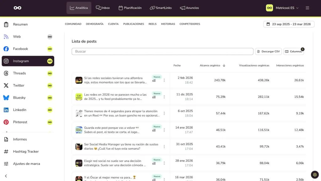 Analizar los resultados de tus posts de Instagram es una de las tareas frecuentes que deberías tener en tu checklist. Si a veces necesitas un traductor entre tantas métricas, Metricool te descubre cada detalle de forma clara y organizada para tomar decisiones.