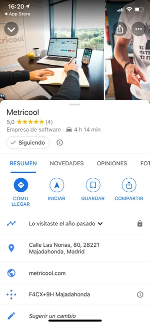 - Justo debajo del nombre y el tipo de empresa aparece la opción “seguir”. Esta información solo aparecerá en la ficha de empresa y desde la App de Google My Business. Haz clic en seguir y voilà…
