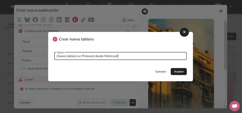 Al programar un nuevo Pin desde Metricool, tienes la opción de crear un tablero, sin necesidad de entrar en Pinterest. Así, organizas el contenido a tu gusto y te aseguras de que cada Pin se publique en el tablero adecuado. Y si el tablero ya existe, solo tienes que seleccionarlo y añadir tu contenido multimedia.
