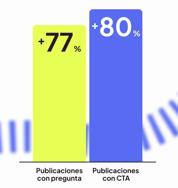 Las publicaciones que incluyen una pregunta directa reciben un 77,39 % más de comentarios en comparación con la media de publicaciones. Si vas un paso más allá e incluyes una llamada a la acción (CTA) específica para comentar, esa cifra sube todavía más, hasta un 80,07 % más.