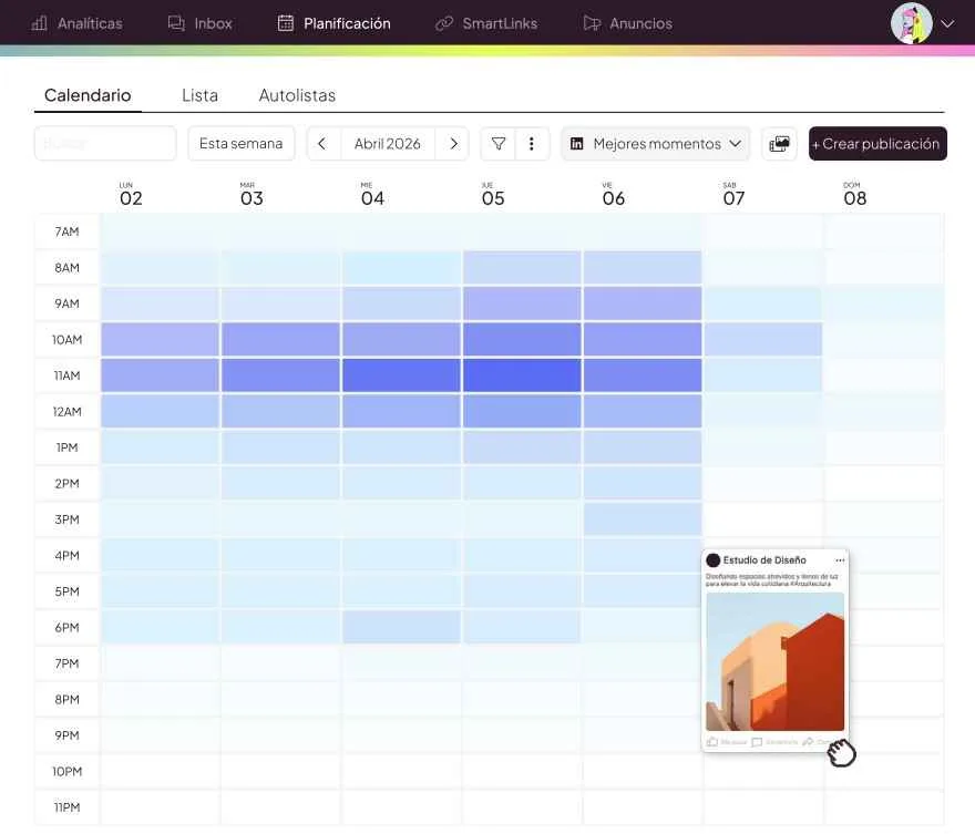 Si un post es importante para tu estrategia, el cuándo lo publicas no debería decidirse al final: forma parte del rendimiento igual que el formato, el copy o el tema. El Estudio también señala que la franja de 9:00 a 12:00 concentra mucha actividad en LinkedIn, así que puede servir como referencia antes de contrastarla con tus propios datos.