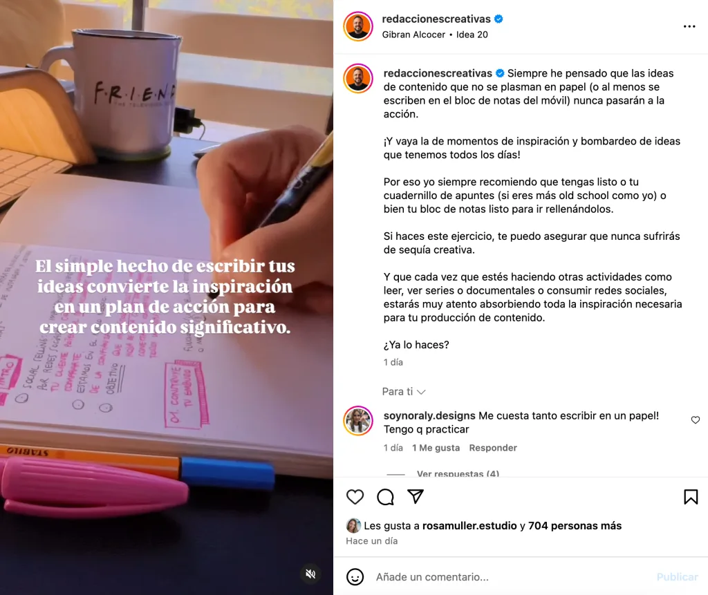 En el post empieza con una historia para conectar con el usuario, una historia en la que seguro muchos se identifican: «las ideas, en papel». Continúa con story telling para enganchar a la lectura y así acabar dejando un CTA que le reporte un buen puñado de interacciones.