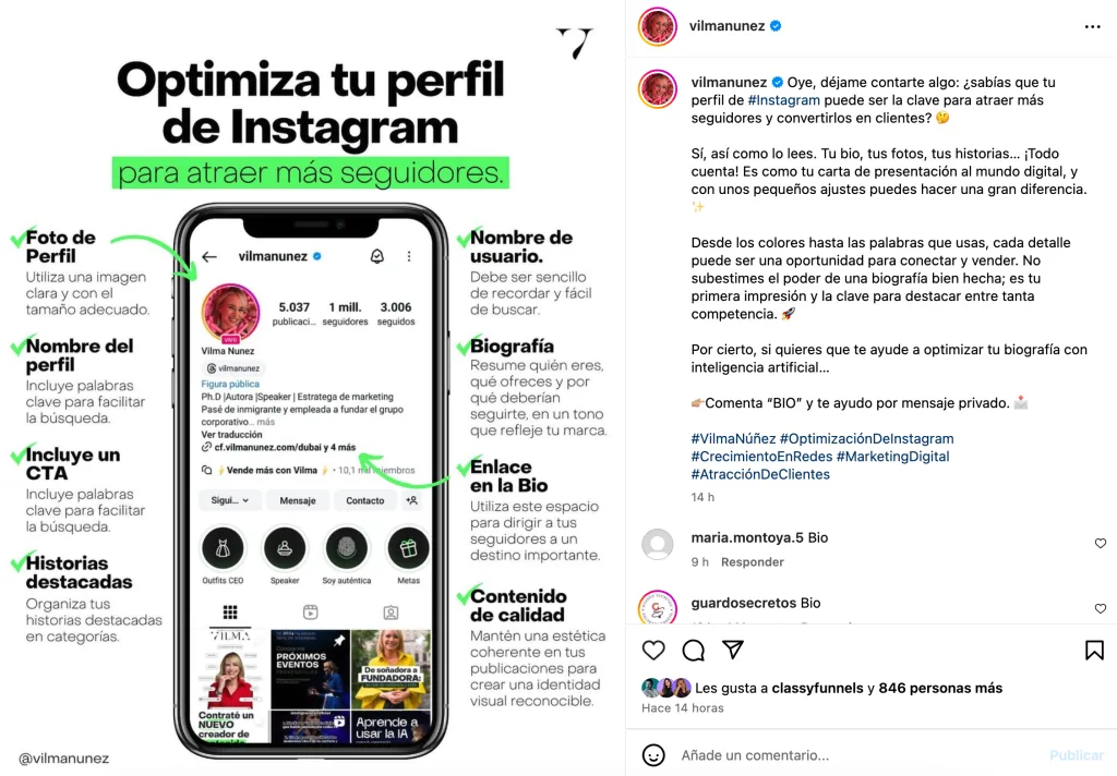 El truco de empezar con una pregunta siempre llama la atención. Si sientes que ese post es para ti vas a quedarte hasta el final. No solo aprovecha para darle importancia al perfil de Instagram y las posibilidades que tiene, si no que deja un CTA para que escribas una palabra en comentarios y tu post «vuele».
