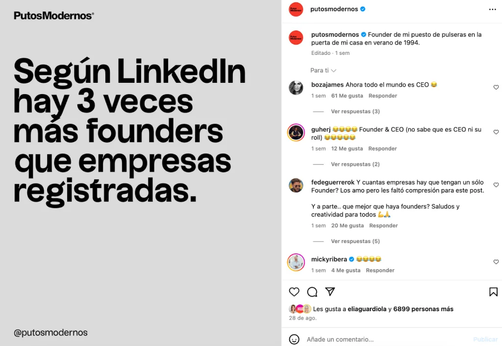 En la cuenta de ‘Putosmodernos’ juegan mucho con esta creatividad. Fíjate que una única frase creativa les sirve para el post que han publicado, conectar con su audiencia y tener miles de interacciones.