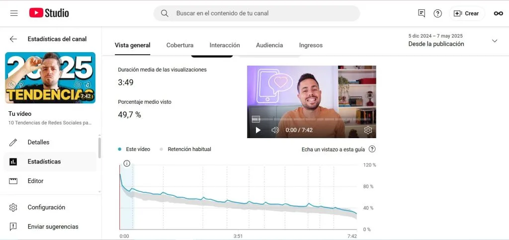 Imagina que publicas un vídeo de 8 minutos, pero la duración media de la visualización es de 5. Es una buena señal e indica que los usuarios ven más del 60 % del contenido.
