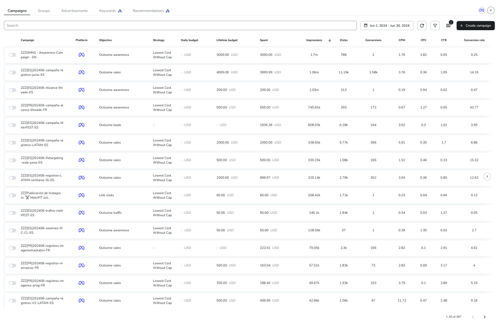 Scroll down within the Meta Ads tab to explore data for each active campaign. Metricool breaks down all the performance metrics you need to evaluate success and ROI.